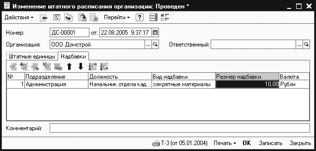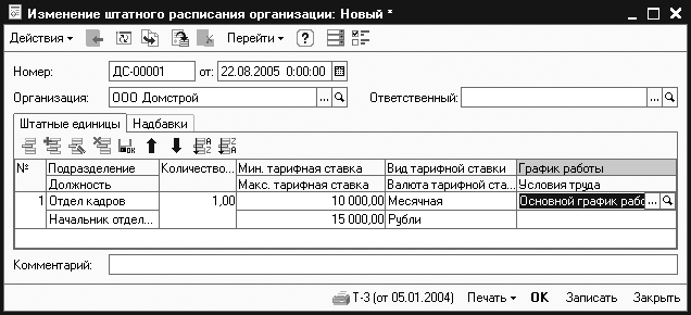Добавлять и редактировать записи можно с помощью кнопки Редактировать на панели инструментов. Открывается специальный документ Изменение штатного расписания. Все изменения вносятся с помощью этого документа. В документе выбираются название должности и подразделение, указываются вилка тарифной ставки, график работы, надбавки.