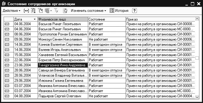 Все текущие документы, связанные с кадровым делопроизводством, фиксируются в журнале Состояние сотрудников организации. В нем отражаются сведения о состоянии работника (рис. 33.6): работает ли в настоящий момент, находится в отпуске или уволен. В журнале хранятся сведения о сотрудниках всех организаций, входящих в состав фирмы. Кнопка Изменить состояние на панели инструментов позволяет ввести документы отклонений (отпуск, увольнение).
