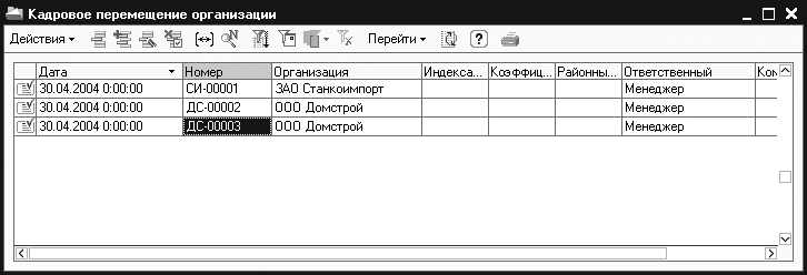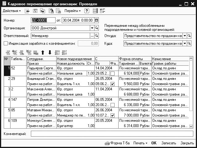 В документе, показанном на рис. 33.8, оформляется перевод сотрудников в юридический отдел организации Представительство по продажам квартир.