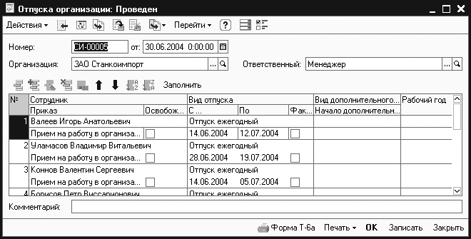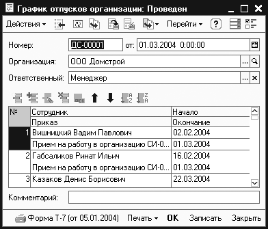 Дважды щелкните на строке с записью в журнале. Документ может выглядеть так, как показано на рис. 33.9. В документе выбирается сотрудник, указывается номер приказа о приеме на работу, вносятся даты начала и окончания отпуска. Документ имеет печатную форму. В отпуск могут быть отпущены несколько сотрудников, новая запись выбирается с помощью кнопки Добавить. Сохраните оформленный документ щелчком на кнопке ОК.