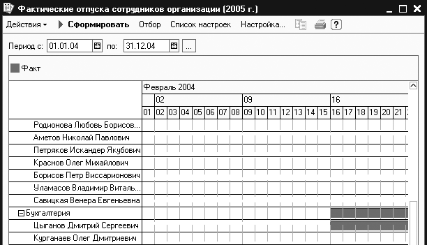 Кнопка Отбор в открывшемся окне отчета позволяет выбрать организацию, подразделение, сотрудника для отчета, кнопка Настройка – изменить порядок вывода позиций в отчет. Щелкните на кнопке Сформировать. Фактически использованные отпуска можно сформировать в виде отчета, распечатать и хранить (рис. 33.14).