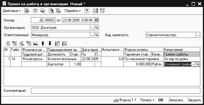 В последней версии программы появилась возможность оформить внешнего совместителя. Для оформления документа откройте журнал Прием на работу в организацию и щелкните на кнопке Добавить. В открывшемся документе заполните такие поля, как Организация, Фамилия сотрудника, График работы, Режим начисления. В поле Вид занятости выберите вариант Внешнее совместительство (рис. 33.17). Сохраните и проведите документ, щелкнув на кнопке ОК. Если в поле Вид занятости выбрать вариант Внутреннее совместительство, то на работу принимается внутренний совместитель.
