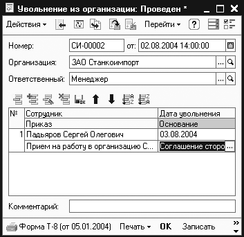 Документ об увольнении сотрудника вносится в журнал Увольнения из организации, который открывается командой Кадровый учет -> Увольнения. В документе укажите сотрудника, организацию, дату увольнения и причину увольнения (рис. 33.18).