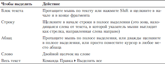 Таблица 6.1. Способы выделения текста в текстовом редакторе Word
