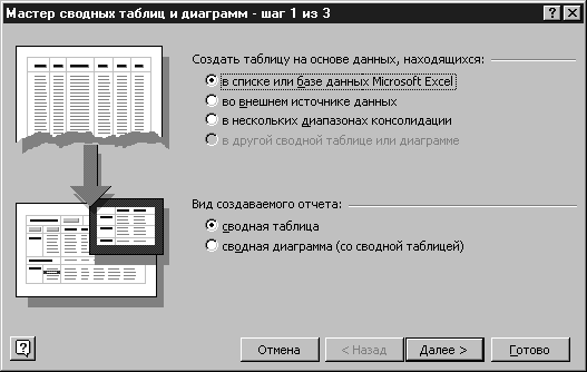 1. Сначала необходимо выделить те данные, которые будут анализироваться. Это может быть таблица, приведенная на рис. 10.10. Затем выбирается команда Данные -> Сводная таблица, открывается окно, показанное на рис. 10.11.