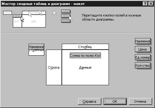 3. Удерживая левую кнопку мыши, перетащите названия полей в правой части окна в соответствующие поля на макете будущей таблицы. Поле Наименование мы переместили в поле Строка, а в поле Данные поместили поле Кол-ство (рис. 10.12).
