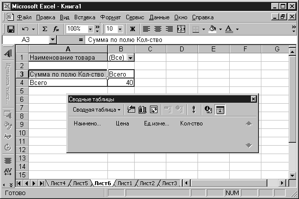 Панель инструментов Сводная таблица поможет вернуться к редактированию сводной таблицы, ввести дополнительные поля, создать отчет. Преобразованная сводная таблица показана на рис. 10.14.