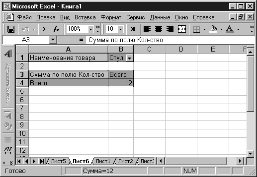 4. Щелкните на кнопке ОК и затем на кнопке Готово. Будет сформирована таблица, из которой понятно, сколько всего изделий продано (рис. 10.13).