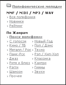 С правой стороны страницы находится меню для поиска по разделам. Мелодии, например (рис. 4.4), распределены по жанрам, так что нужно сделать всего один щелчок кнопкой мыши, и вам будет предоставлен весь перечень мелодий любимого жанра. К тому же с помощью ссылки Новинки вы получите список мелодий, поступивших на сайт за последнее время.