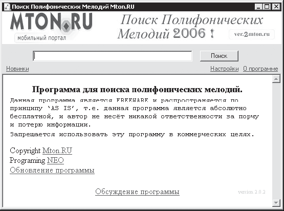 Рис. 4.13. Окно настроек программы «Поиск Полифонических Мелодий Mtone.Ru».