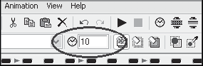 Теперь давайте настроим параметры анимации. Сначала установим время, в течение которого кадр будет находиться в активном состоянии. Для этого выделите нужный кадр и установите время задержки в поле с изображением часов, расположенном на панели инструментов (рис. 6.8).