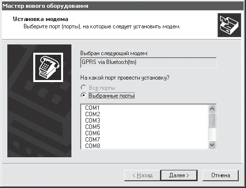 3. Появится окно со списком установленных в вашей операционной системе модемов. По умолчанию будет выбран первый в списке модем. Если это не то, что вам нужно, снимите флажок и выберите установленный вами модем, который будет использоваться для доступа в Интернет по технологии GPRS. Перейдите к следующему окну, нажав кнопку Далее.