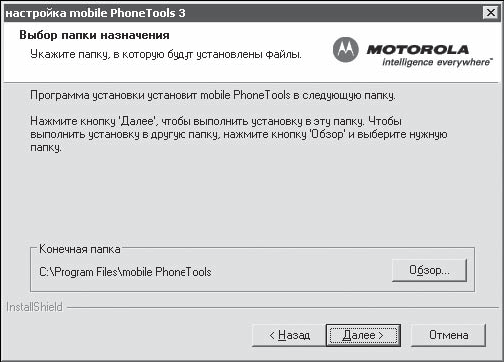 Перед первым подключением телефона запустим программу установки Setup.exe. При этом последовательно появятся обычные для любых программ установки окна с предложением прочитать и принять пользовательское соглашение, а затем выбрать папку для установки программы (рис. 2.1). Здесь уместно соглашаться с предлагаемыми по умолчанию значениями и каждый раз нажимать кнопки Далее, Да и Завершить.