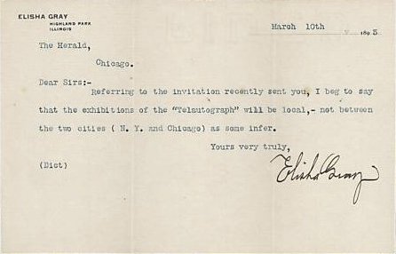 Письмо Элиши Грей устроителям выставки, в котором он сообщает о невозможности демонстрации удалённой работы телеавтографа "по техническим причинам"