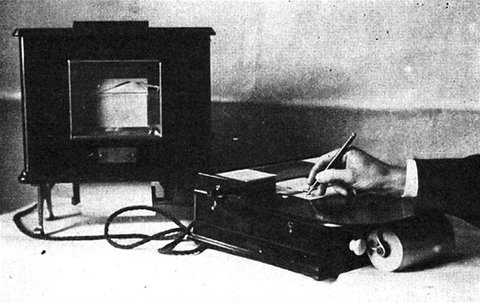 Оператор водил пером по движущейся в передающем устройстве ленте, а в приёмнике хитроумный механизм с сифоном, наполненным жидкими чернилами, двигался подобно перу нынешних сейсмографов, вычерчивая непрерывную линию рукописного текста. Пробелы между словами фиксировались как горизонтальная линия.
