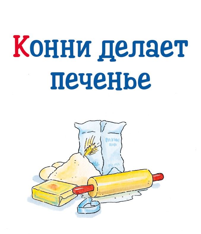 Конни нетерпеливо листает книгу и наконец находит рецепт своего любимого печенья. На картинках показано, что нужно для его приготовления: мука, сахар, масло, два яйца и посыпка для украшения.