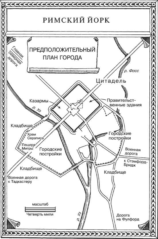 Судя по размерам древнего римского кладбища, Эборак был большим городом. Крепостная стена – от которой до сих пор сохранилась одна башня – окружала только территорию цитадели, занимавшей очень небольшую площадь в сравнении с городом, распространившимся и за реку, и вдоль военных дорог… Стены средневекового Честера были построены на стенах римского Дэва из более мягкого и поэтому более дешевого камня. Однако стены средневекового Йорка окружали гораздо большую территорию, чем стены римского Эборака. Южная и восточная стены римского города полностью разрушились, но северная и западная были восстановлены и стали частью стены средневекового города… Вполне возможно, что в Средневековье старая римская стена была продлена, чтобы таким образом включить в себя территорию прежде не защищенного римского города. Тот факт, что от этого города не осталось никаких следов, не вызовет удивления, если вспомнить, что и здания внутри римской стены не сохранились, да и едва ли следы прошлого могли сохраниться за тысячелетнюю историю процветающего города. Если мы будем считать средневековую стену Йорка границей римского города, мы, по крайней мере, поймем, почему кладбища располагаются за стеной. Такова была римская традиция, как в Риме, так и в Йорке.