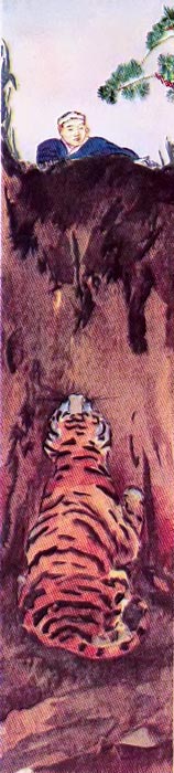 Всю ночь просидел тигр в яме. А утром он услышал над своей головой какой-то шум. Хозяин гор задрал морду и увидел наверху охотника.