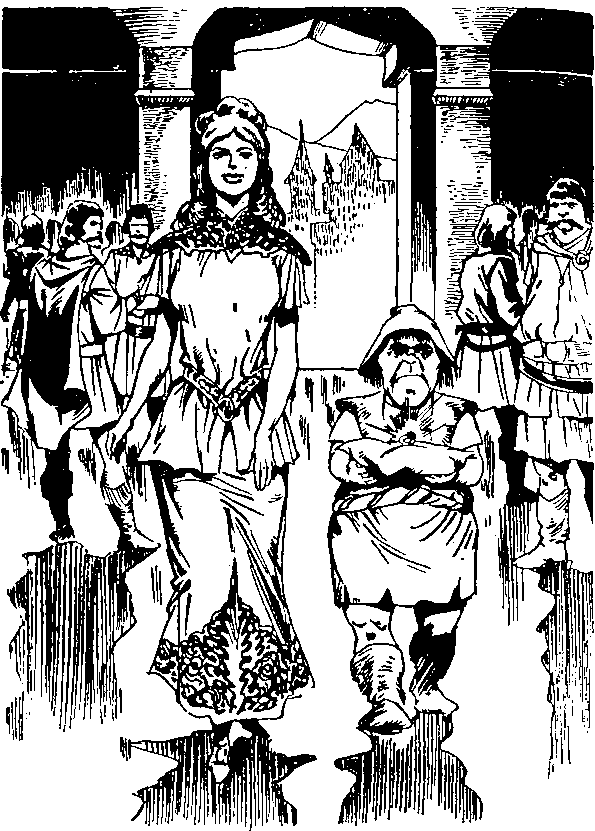 И вот в самый разгар веселья во дворце появились двое, сразу привлекшие к себе внимание, — красивая высокая девушка и уродливый карлик. На девушке сверкала атласная одежда огненного цвета, у нее были рыжие волосы и черные как смоль глаза. Карлик тоже был во всем огненно-красном и на руках держал подушку из алого шелка, на которой лежало кольцо с немыслимой красоты рубином.