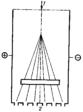 Рис. 13. Электрофорез в свободном потоке жидкости (1 — подача раствора; 2 — отбор фракций). Разделение фракций осуществляется в направлении, перпендикулярном течению раствора между электродами