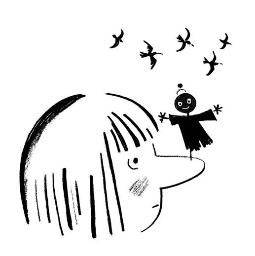 Тогда сосед дядя Миша устроил мне на носу пугало. Как в огороде, только поменьше. На голове у пугала была шапочка с помпончиком. А вместо головы – старый мячик с нарисованным лицом. Пугало смотрело на меня и улыбалось. От ветра оно смешно дрыгало руками, и птицы больше ко мне на нос не садились.