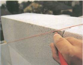 Лучше всего натянуть шнуры в плоскости опоры плит. Каждый блок вначале подгоняется всухую и отмечается линия кривизны опор. Резать блоки очень легко и просто, особенно если строить из пористого бетона и иметь в распоряжении ленточную пилу.