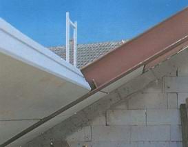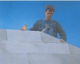 Теперь уложены плиты крыши и начинается облицовка ее края. Эта работа знакома вам по строительству перекрытия из сборных блоков. Изнутри на бортовые блоки кладутся теплоизолирующие плиты, затем собирается и бетонируется кольцевой анкер (используйте распорки и смочите кладку). До того как зазоры между плитами будут заполнены раствором, в них кладутся стальные прутья. Кстати, кольцевой анкер проводится также под коньком крыши.