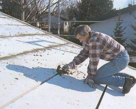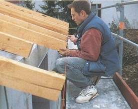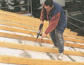 Теперь речь идет о кровельных работах. Если пространство под крышей позднее должно использоваться как жилое помещение, необходима дополнительная теплоизоляция. Вначале кладется ребром на плиты крыши деревянный брус. При этом нужно выбрать брус с поперечным сечением, соответствующим толщине изоляционного материала: брусья должны быть минимум на 4 см выше, чем толщина изоляционного материала. Это пространство позднее будет использоваться для вентиляции. Толщина теплоизоляции у группы с коэффициентом теплопроводности 0,35 — от 5 до 8 см (ориентировочные значения). Указание: спросите у консультанта, какой толщины должна быть теплоизоляция.
