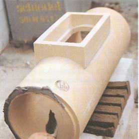 Блок с отверстием уложен. Теперь можно встраивать теплоизоляцию и шамотную фасонную деталь. Соединение шамотных труб между собой осуществляется специальной замазкой для заделки швов. Шов не должен быть шире чем 7 мм. Трубу, которая должна быть установлена, переворачивают и наносят замазку. Затем ее снова переворачивают и осторожно задвигают через облицованное отверстие. При этом высоко выступающий обод края фальцевого соединения шамотной трубы должен быть обращен вверх. Тогда, позднее не сможет затечь ни одна капля воды (дождевая вода, роса) в конструкцию дымовой трубы. Внимание: до установки соединения дверцы для очистки нужно нанести раствор на следующий блок-оболочку. Если фасонная деталь задвинута, то можно уже больше не накладывать шаблон для раствора. На свежий слой раствора ставится точно по линии соединения следующий необработанный блок-оболочка. Затем вложить теплоизоляционную плиту. Совет: при замешивании замазки для заделки швов в точности придерживайтесь данных по дозировке. Достаточно совсем немного воды. Вначале кажется, что в емкости находятся одни сухие крошки. Вода быстро «всосалась». Но после продолжительного размешивания (в течение 5 мин.) образуется гомогенная замазка. И замешивайте небольшие количества.