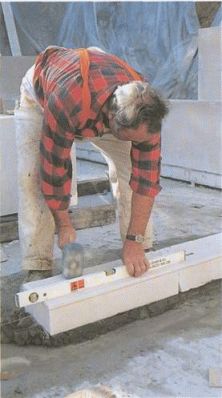 Крупные блоки также выравниваются с помощью резинового молотка.