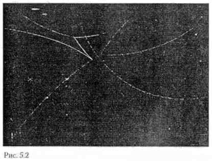 Мы не можем наблюдать отдельный кварк или глюон из-за конфайнмента. Не означает ли это, что само представление о кварках и глюонах как о частицах несколько метафизично? Нет, потому что сильное взаимодействие характеризуется еще одним свойством, которое называется асимптотической свободой. Благодаря этому свойству понятие кварков и глюонов становится вполне определенным. При обычных энергиях сильное взаимодействие действительно является сильным и плотно прижимает кварки друг к другу. Но, как показывают эксперименты на мощных ускорителях, при высоких энергиях сильное взаимодействие заметно ослабевает и кварки и глюоны начинают вести себя почти как свободные частицы. На рис. 5.2 представлен фотоснимок столкновения протона и антипротона высокой энергии. Мы видим, что несколько почти свободных кварков, родившихся в результате взаимодействия, образовали «струи» треков, которые видны на фотографии.