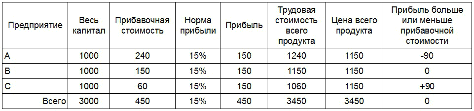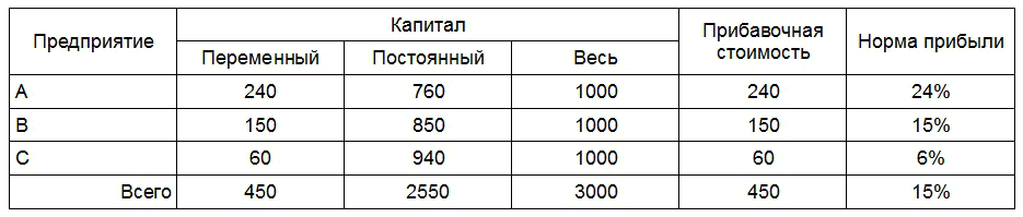 Положим, что мы имеем 3 предприятия в трех различных отраслях производства. Одно из них А обладает низким органическим составом капитала: роль машин по сравнению с ролью живой рабочей силы в нем незначительна. Второе предприятие В обладает средним, а третье С — высоким составом капитала: оно применяет усовершенствованные технические средства и при помощи сравнительно небольшого количества рабочих приводит в движение огромные по стоимости количества материалов, вспомогательных средств и т. д.