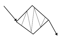 Фигура «Алмаз» – очень надежная модель для получения прибыли и состоит из четырех сторон, которые образует цена. Эта модель похожа на два симметричных треугольника, соединенных вместе. «Алмаз» одновременно является моделью продолжения и разворотной моделью. В середине тенденции эта модель, скорее всего, станет фигурой продолжения. А если фигура формируется уже на излете тенденции, то эта модель будет иметь разворотный характер (рис. 95).