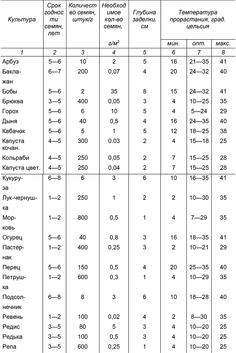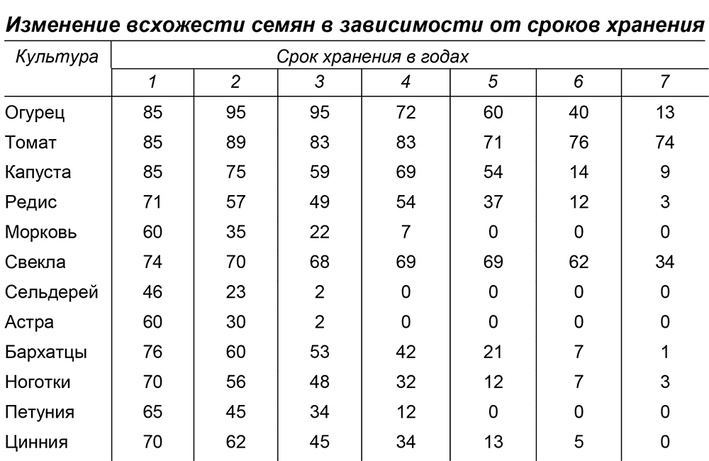 Семена лучше использовать районированных сортов. Гибриды (F1) дороже семян, так как при их выращивании приходится делать опыление вручную, но они быстрее развиваются, дают лучший урожай и более устойчивы к болезням, так что затраты на них оправдывают себя. Свои семена из гибридов получать не следует, так как они не передают свои свойства по наследству. Прежде, чем покупать семена впрок, посмотрите сколько лет они сохраняют всхожесть (всхожесть семян – это отношение числа взошедших семян на сто посеянных). С течением времени всхожесть семян изменяется, постепенно снижаясь для каждой культуры по-разному. Неправильное хранение семян резко ухудшает их всхожесть. Хранить семена следует при постоянной температуре и влажности, лучшая температура для их хранения 10–12°C. Если вы храните семена в городской квартире, то пакетики с семенами следует сложить в стеклянную банку и закрыть крышкой или хранить их в целом целлофановом пакете, который надо завязать, чтобы семена не пересыхали. Банки и пакеты с семенами лучше всего поставить на подоконник. Семена переносят отрицательные температуры без ухудшения своей всхожести, но очень плохо переносят переменные температуры, поэтому их нельзя хранить в помещении, которое время от времени протапливается, так как происходит временное повышение влажности воздуха, семена отпотевают, затем высыхают, потом снова отпотевают, что и приводит к потере всхожести.