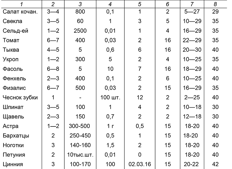 Для определения необходимого вам количества семян для посева возьмите из таблицы данные о нужной вам культуре и умножьте на длину грядки, отведенной под эту культуру. Не следует сеять слишком густо, но и через – чур разреженный посев тоже не годится. При густых посадках растения будут угнетать друг друга, а при прореживании можно повредить соседние растения. При слишком разреженном посеве общая энергия прорастания (по принципу – вместе мы сильней) резко падает, семена прорастают хуже, больше угнетаются сорняками, которые являясь родными детьми матери-природы, награждены ею большей энергией прорастания и жизнестойкостью нежели культурные растения, поэтому сорняки моментально воспользуются возможностью занять свободное место на грядке. По этой же причине сеять лучше не рядами, а сплошь засевать грядку, тогда для сорняков просто не найдется на грядке места. Привычка сеять и сажать рядами пришла к нам на участок из совхозно-колхозного опыта, где такой посев обусловлен применением техники.