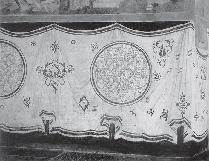 Надо сказать, что обычай вешать длинное вышитое «полотенце», рушник, внутри церкви, вдоль ее стен, как бы окружая тем самым внутренность всего храма, в древности бытовал на Руси. Сегодня в церквях рушники вдоль стен уже не вешают, однако память об этом старинном русском обычае сохранилась. На внутренних стенах многих старинных русских храмов, на уровне человеческого роста, можно увидеть опоясывающее изображение длинного рушника-полотенца. То есть вместо того, чтобы вывешивать настоящее «полотенце», его, начиная с XVII–XVIII веков, стали просто РИСОВАТЬ КАК ФРЕСКУ на стенах церкви. На рис. 1.23, рис. 1.24, рис. 1.25, рис. 1.26 и рис. 1.27 мы приводим примеры подобных изображений «опоясывающих полотенец» в храмах Московского Кремля. Так что ковер из Байе прекрасно вписывается в этот старинный ордынский обычай. Его, – как длинное полотенце-рушник, – вывешивали вокруг нефа храма по праздникам. По-видимому, так раньше поступали по всей территории Великой = «Монгольской» Империи. В том числе и в Западной Европе.
