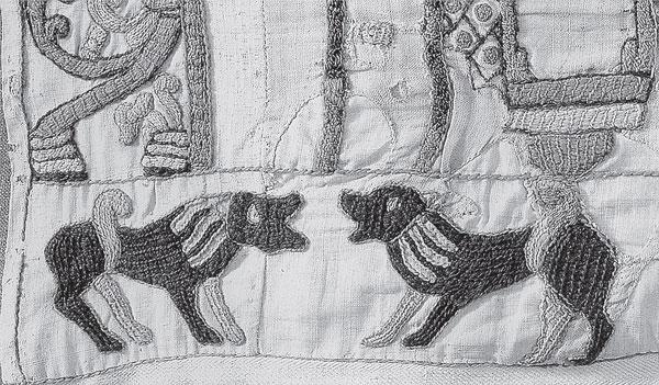 В каймах ковра из Байе присутствует несколько изображений львов. Обычные львы, с большой гривой и хвостом. Больше всего львов имеется на листах 1–2, см. рис. 1.1. А именно, здесь мы видим двух львов вверху, см. рис. 1.29, и четырех внизу, рис. 1.30 см. и рис. 1.31. Таким образом, всего здесь показано шесть львов. Такое большое скопление львов – единственное на всем ковре.