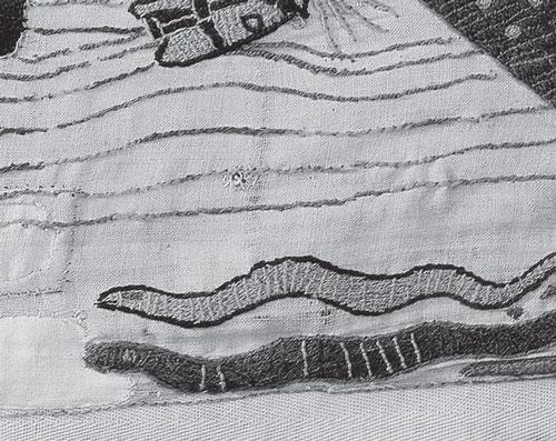 Листы 19–20, внизу, см. рис. 1.6, рис. 1.53 и рис. 1.54. Изображено несколько волн-змей, плывущих в одну сторону. Одна волна-змея «вытекает» из руки лежащего мужчины. Другая волна-змея «вытекает» изо рта мужчины. По-видимому, художник хотел сказать, что и все остальные волны-змеи также появились изо рта или руки лежащей фигуры. Скорее всего, здесь показано созвездие Водолея. Часто в руке Водолея на звездных картах изображали кувшин, из которого льются струи воды. На ковре из Байе струи воды изобразили в виде волнистых водяных змей.