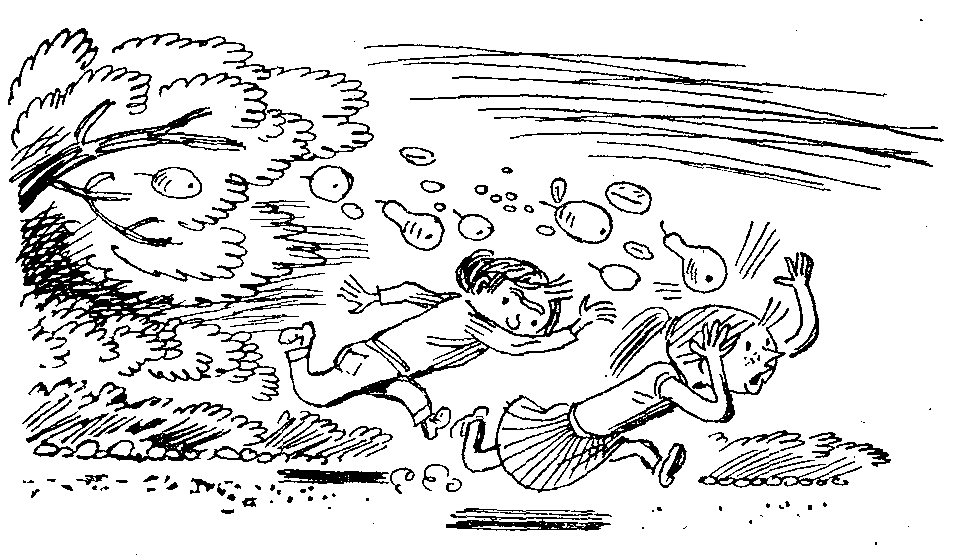 Град плодов обрушился на головы Жанны и Зори, Вслед за яблоками и грушами посыпались апельсины, лимоны, бананы и, о ужас, кокосовые орехи!
