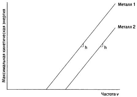 Рис. 3. Фотоэлектрический эффект — максимальная кинетическая энергия испускаемых электронов в зависимости от частоты света, падающего на металлическую поверхность.