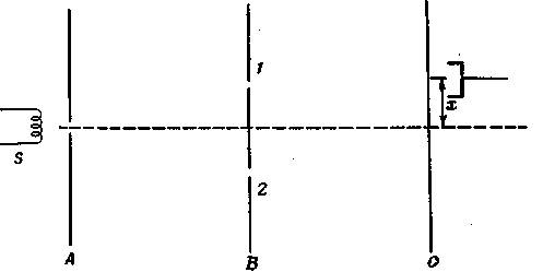 Фиг. 1.1 поясняет наш воображаемый опыт. В точке A расположен источник электронов S. Все электроны вылетают из этого источника с одной и той же энергией в направлении экрана B. Этот экран имеет отверстия 1 и 2, через которые могут проходить электроны. Наконец, за экраном B в плоскости C расположен детектор электронов, который можно помещать на различных расстояниях x от центра экрана.