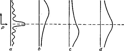 Вероятность попадания электронов в точку я представлена как функция положения детектора x. Кривая a — результат эксперимента, изображённого на фиг. 1.1. Случаю, когда открыто только отверстие 1 и электроны могут пролетать только через это отверстие, соответствует кривая b; открытому отверстию 2 соответствует кривая c. Если предполагать, что каждый электрон проходит только сквозь одно отверстие из двух, то в случае, когда открыты оба отверстия, мы должны были бы получить кривую d=b+с. Это существенно отличается от кривой a, которую мы получаем в действительности.