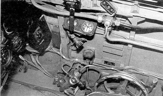 Приборная доска истребителя Ла-7; новые приборы: А — авиагоризонт (на самолетах поздних серий), В — индикатор радиополукомпаса, ручка настройки частоты радиостанции, D — панель органов управления радиостанцией. Е — вентиль наддува топливных баков нейтральным газом.