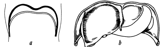 Рис. 3. Расположение печени и селезенки под диафрагмой и движения диафрагмы: а – при вдохе; б – при выдохе