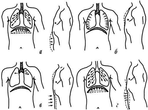 Рис. 4. Типы дыхания: а – нижнее; б – среднее; в – верхнее; г – смешанное