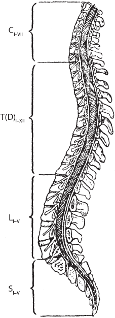 CI–VII – шейный отдел; T(D)I–XII – грудной отдел; LI–V – поясничный отдел; SI–V – крестцово-копчиковый отдел