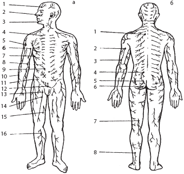 а – спереди: 1 – лобный (I ветвь тройничного нерва); 2 – подглазничный (II ветвь тройничного нерва); 3 – подбородочный (III ветвь тройничного нерва); 4 – передние и латеральные кожные ветви межреберных нервов; 5 – мышечно-кожный нерв плеча; 6 – медиальный наружный кожный нерв плеча; 7 – наружные кожные ветви межреберных нервов; 8 – медиальный кожный нерв предплечья; 9 – передние кожные ветви межреберных нервов; 10 – наружный кожный нерв предплечья; 11 – наружный кожный нерв бедра; 12 – кожная ветвь подвздошно-подчревного нерва; 13 – половая ветвь бедренно-полового нерва; 14 – кожная ветвь бедренного нерва; 15 – кожная ветвь запирательного нерва; 16 – медиальный подкожный нерв икры; б – сзади: 1 – задние ветви грудных нервов; 2 – задний кожный нерв плеча; 3 – задний кожный нерв предплечья; 4 – верхний ягодичный нерв; 5 – грушевидный нерв; 6 – нижний ягодичный нерв; 7 – задний кожный нерв бедра; 8 – латеральный кожный нерв икры