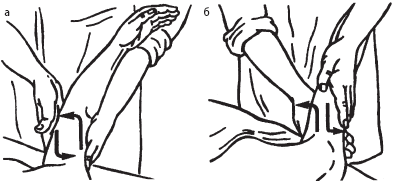 Валяние выполняется чаще всего на конечностях. Руки массажиста ладонными поверхностями обхватывают с обеих сторон массируемую область, пальцы выпрямлены, кисти параллельны, движения производятся в противоположных направлениях с перемещением по массируемой области. Применяется на бедре, голени, предплечье, плече (рис. 38).