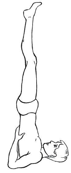 Прямые ноги вытягивают вверх так, чтобы пятки оказались надо лбом. Часть позвоночника (примерно до середины груди) должна плотно прижиматься к поверхности пола.
