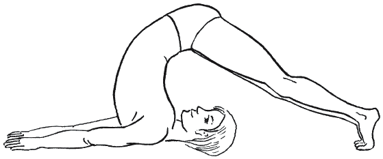 Принимают исходное положение – позу плуга (халасану), согнув при этом руки в локтях и упершись ладонями в нижние ребра, как при выполнении сарвангасаны. Опираясь на локти и верхнюю часть спины, приподнимают ноги и заводят их вправо, чтобы носки ног оказались на уровне головы. Руки, голова, шея и грудь должны остаться в исходном положении.